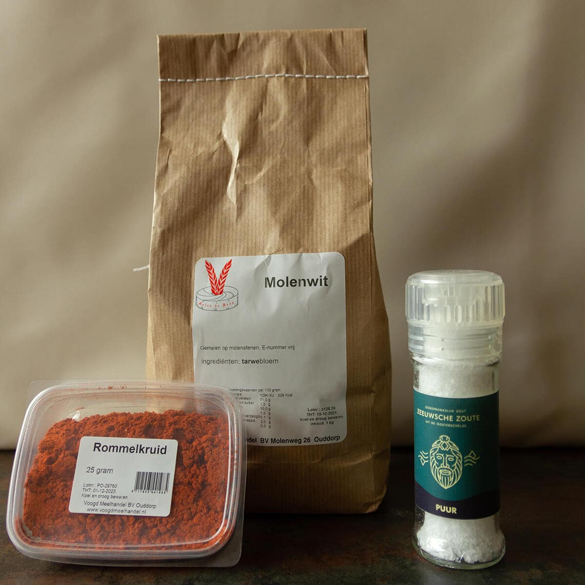 De tarwebloem en het rommelkruid komt van Voogd Meelhandel in Ouddorp. Het familiebedrijf (sinds 1845) produceert ambachtelijke producten voor de bakkerij, industrie en retail. In hun Molenwinkel verkopen ze meel, eten en speeltjes voor dieren en andere producten.