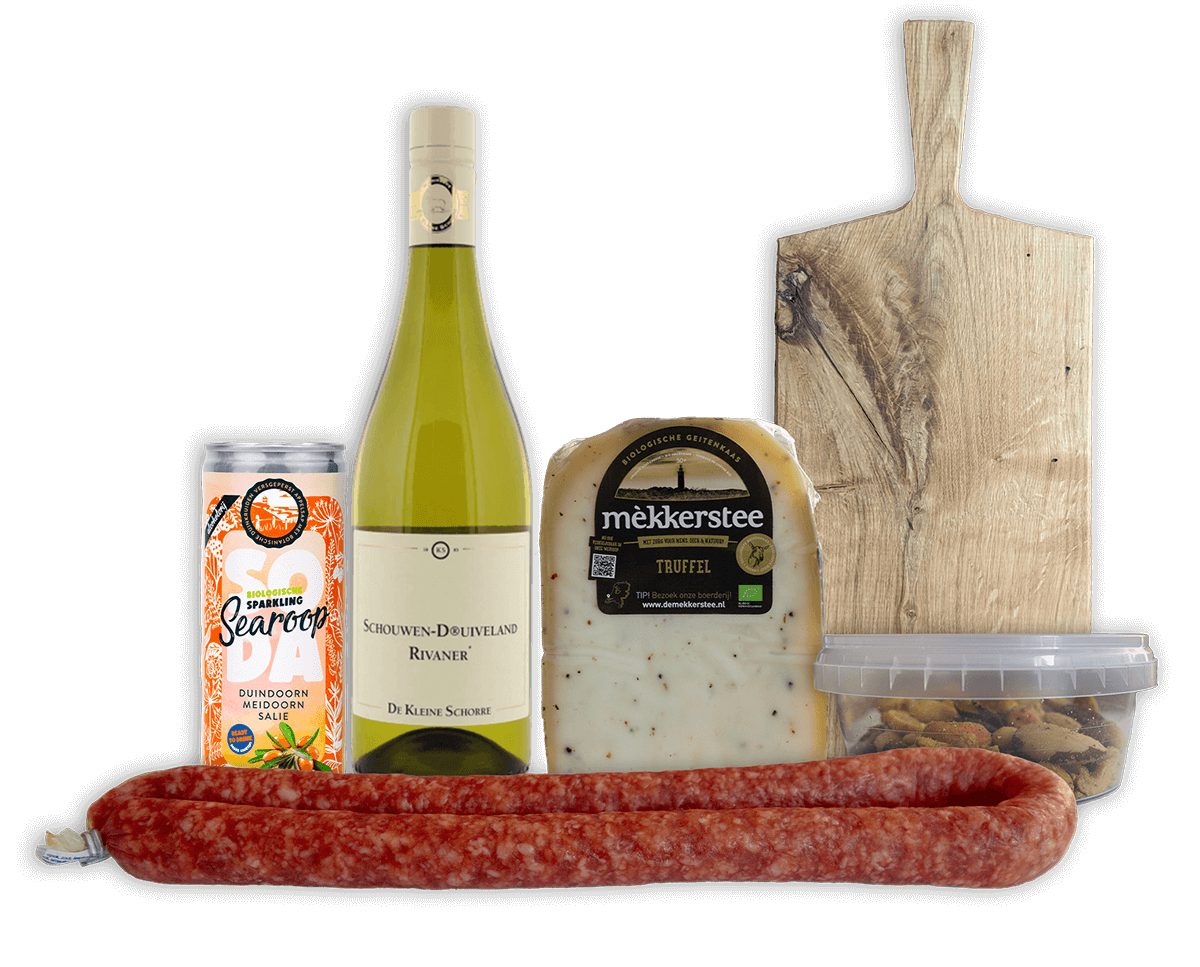 Geniet samen van een borrel met Zeeuwse streekproducten. Dit borrel kerstpakket is gevuld met: