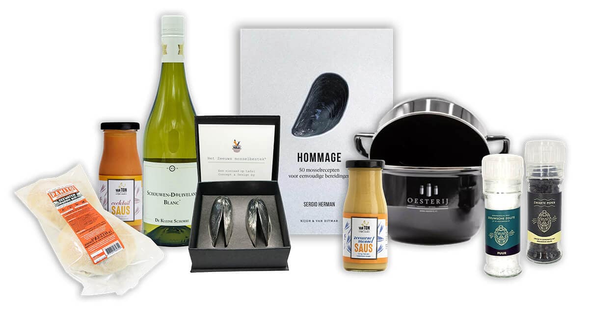 Een prachtig pakket rondom de Zeeuwse trots: de mossel! Met dit kerstpakket haal je alles in huis voor een avondje mosselen. Uiteraard mag daarbij een bijpassende wijn van Wijnhoeve de Schorre niet ontbreken.